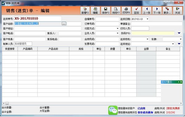 送货单号由系统自动生成(可按年+月+日+流水号等多种格式生成送货单号,也可根据客户名称分别进行流水编号)。