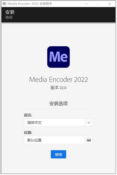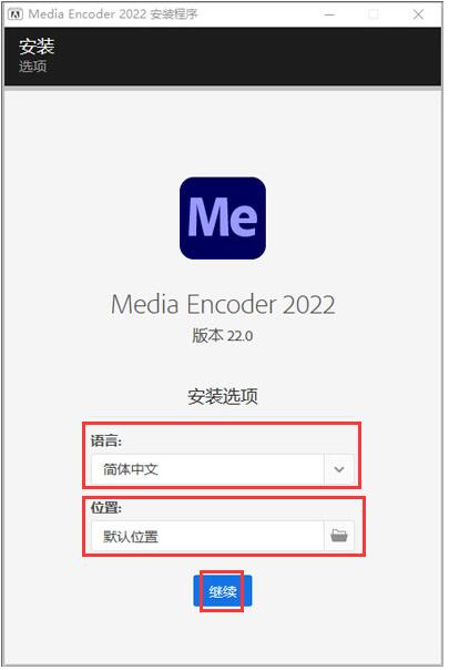 3.选择Media Encoder 2022安装语言和安装位置,单击【继续】