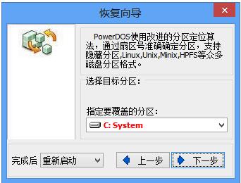 第三步: 选好目标分区后,按”下一步”按钮,此时Windows下的操作已经完成,PowerDOS会询问你如何执行这个任务