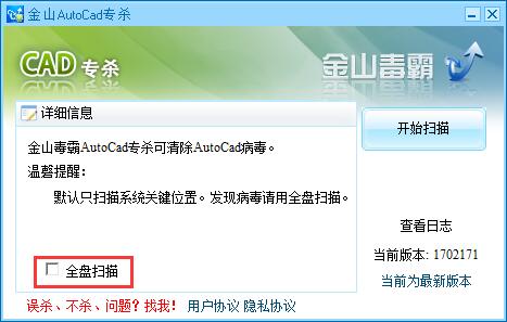 金山CAD病毒专杀工具是从金山毒霸中分离出的一款专用的CAD病毒专杀软件,利用金山毒霸的强大的扫描引擎,知识兔可以快速的扫描出系统中的CAD病毒并且知识兔查杀,软件默认系统关键位置CAD病毒的查杀,如需全盘扫描请勾选全盘扫描选项。