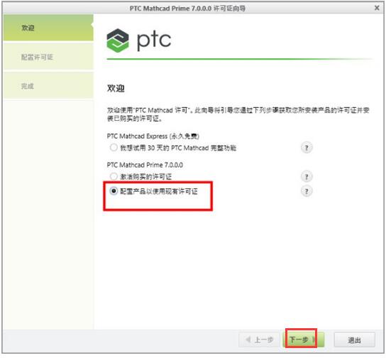 6.运行PTC Mathcad Prime,进入欢迎界面,知识兔选择【配置产品以使用现有许可证】,单击【下一步】