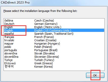 2.先运行安装文件,知识兔双击install-caddirect-2023-pro-x64-win10-11.msi文件,知识兔选择CADdirect2023安装语言,没有中文知识兔选择英文,单击【OK】