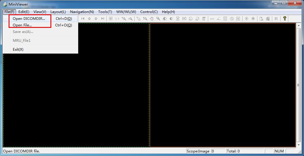 2.单击【File】选择【open DICOM】或者【open file】选择需要查看的图像文件