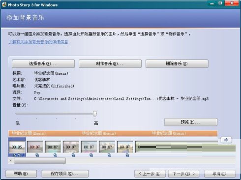 知识兔可以选择知识兔喜欢的音乐作为PhotoStory的背景音乐,知识兔支持MP3、WMA、WAV格式。知识兔可以在照片的某一些章节用一首歌,下一个章节换一首,这样就不会单调。下面的导航栏会显示这首歌持续到哪一张照片。用自己唱的歌再配上自己的照片,这就是一部简单的MV啦。