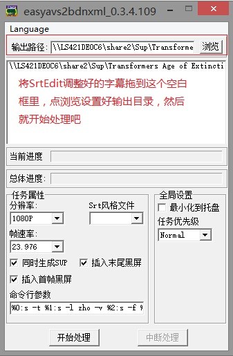 easyavs2bdnxml是一款简单的字幕生成软件,配合Avisynth_258运行库文件,知识兔可以将导入的有效ASS字幕转化成SUP格式的字幕,能够调整分辨率、srt风格、帧速率和任务优先级等参数,知识兔支持同时生成SUP、插入末尾黑屏和插入首帧黑屏等。