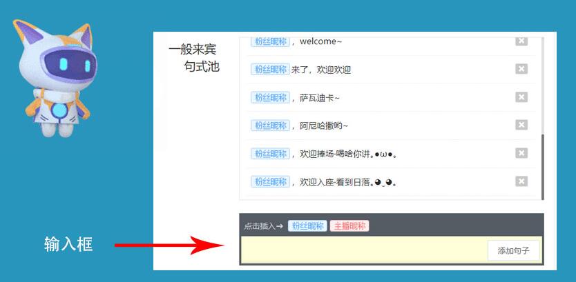 「来宾欢迎」:进场用户自动欢迎,独家支持欢迎小白号。