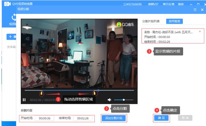 2.添加文件成功后,会在【视频分割界面】播放视频,拖动剪辑标尺,知识兔选择剪辑片段,会显示开始时间和结束时间,知识兔点击【添加分割片段】,列表显示剪辑的片段时长,最后知识兔点击确定回到主界面.