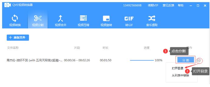 3.在主界面中知识兔点击【分割】按钮,等待进度100%,剪辑的视频片段导出在本地,知识兔点击更多操作,知识兔选择打开目录.
