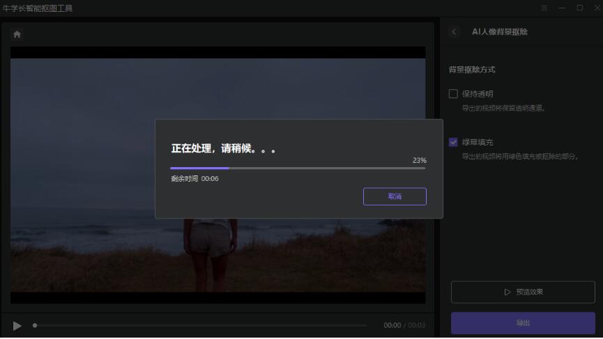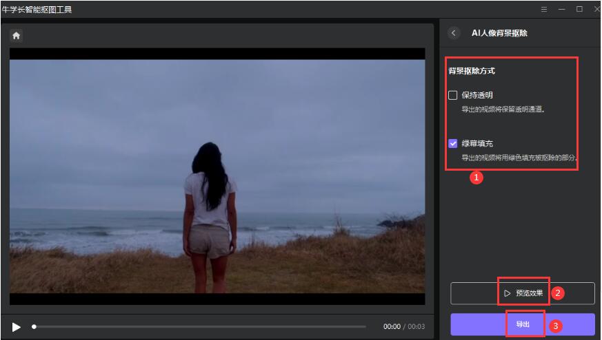 步骤四:选择【背景抠除方式】,分为保持透明和绿幕填充两种,这里知识兔选择第二项,然后知识兔单击【预览效果】查看抠除的效果,满意的话单击【导出】按钮