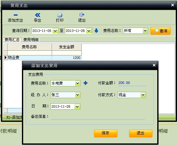 1.费用支出(如下图):在费用支出中,用户可以根据本店的情况设置多种费用,实际产生费用时,在此登记入账。日后可以在此窗口的”费用明细”标签查询某一时间段的费用支出状况。