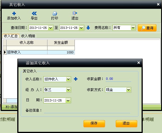 2.其它收入(如下图):其它收入主要用来登记除配件销售和维修结算这些主营业务收入以后的其它杂项收入,如卖旧件等。收入种类可自行定义。实际产生其它收入时,在此登记入账。日后可以在此窗口的”收入明细”标签查询某一时间段的其它收入状况。