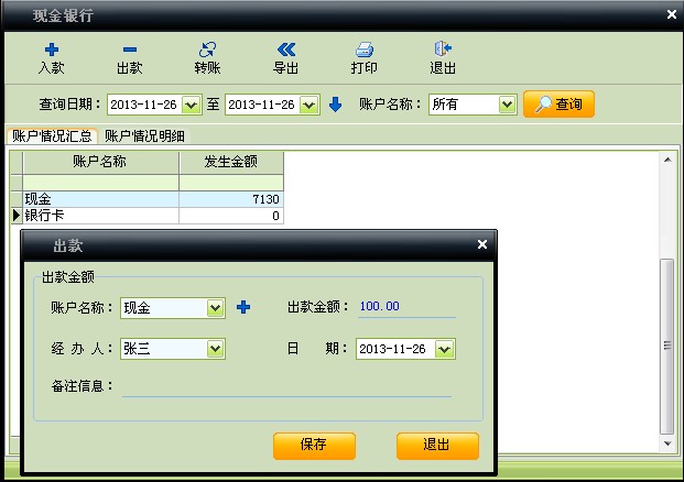 3.现金银行(如下图):在此可以查询到销售收入和维修收入的各种付款方式金额的汇总,在此可以直接”出款”或是在不同的付款方式之间转账,知识兔双击某一个账户名称,知识兔可以切换到账情况明细,显示此账户收款的明细记录。