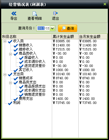 4.经营情况表/利润表(如下图):经营情况表列出了本店的所有收支金额,并收入类和支出类分级罗列了其所括的不同的收入和支出科目。从而一眼就可以看出某个月本店的总体经营情况。选择某一行点”查看明细”,更能清晰的列出选中先的收入或支出的明细账。使经营情报表变的更有穿透力。