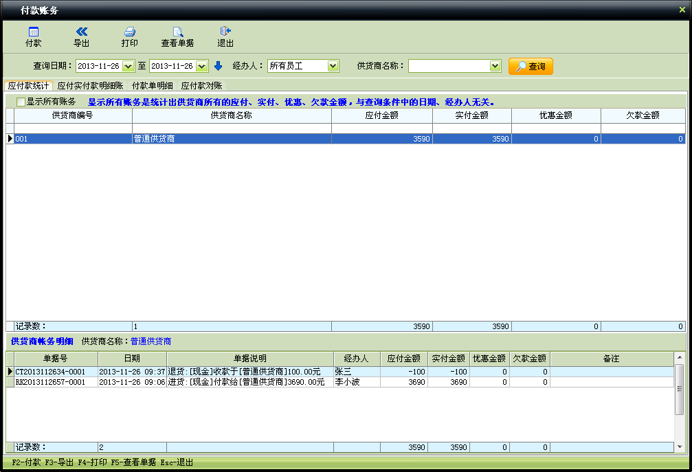 5.付款分析(如下图):付款分析用于查询统计所有供货商和单个供货商的付款情况,能反应出应付金额,实付金额,优惠金额,和欠款金额等。能实时掌握所有和所有供货商的账务往来状况