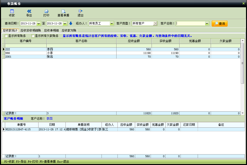 6.收款分析(如下图):收款分析用于查询统计所有客户和单个客户的收款情况,能反应出应收金额,实收金额,优惠金额,和欠款金额等。能实时掌握所有和所有客户之间发生的的账务往来状况