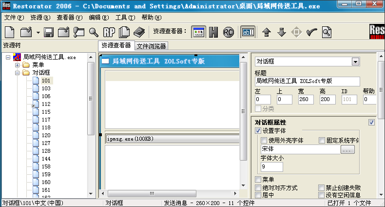3、在”资源树”里找到”对话框”鈥斺€?101″,在右侧”标题”修改你希望看到的软件标题栏显示内容。中间的”资源查看器”会有预览。效果图如下: