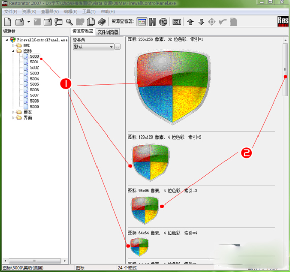 6、请将你要替换的ico全部放到同一个文件夹里面,并对应图标在应用文件里面的编号(红1),比如:5000对应的是安全,5004对应的是防火墙 。。.。。.(红2)这里是文件游览器,方便知识兔查看要替换用的ICON 。