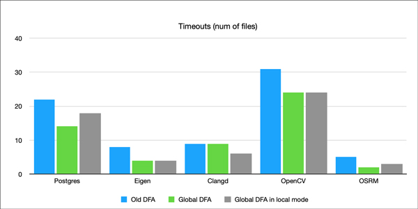 2、知识兔比较了在全局和本地模式下运行的以前和当前的DFA实现。以下是知识兔从MAC机器(Big Sur 11.0、2.6 GHz六核Intel Core i7、16 GB RAM)获得的测量结果。对于测试,知识兔采用了5个项目:Postgres,Eigen,clangd,OpenCV和OSRM。知识兔分别测量了每个DFA步骤的效果: