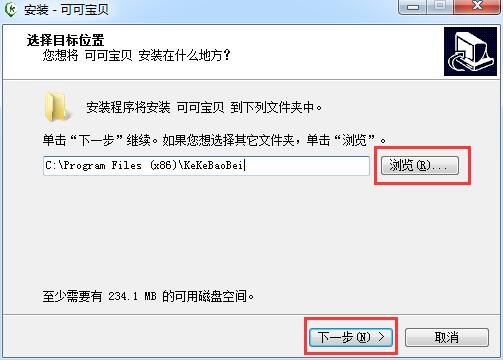 1.知识兔双击运行exe文件,出现安装位置选择界面,默认的是【C:\Program Files (x86)\KeKeBaoBei】,单击【浏览】选择其他文件夹
