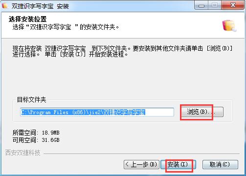 3.选择软件的安装位置,系统默认安装到【C:\Program Files (x86)\jie2\双捷识字写字宝】,知识兔选择其它文件夹单击【浏览】,然后知识兔单击【安装】开始安装进程