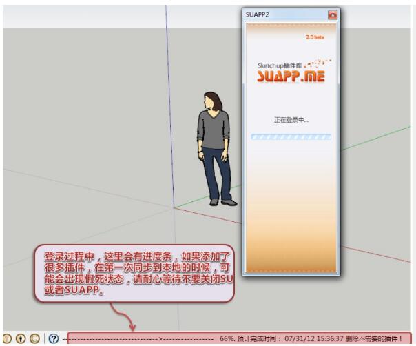 登录过程中,SketchUp底部状态栏会有进度条,如果知识兔添加了很多插件,在第一次同步到本地的时候,可能会出现假死状态,请耐心等待不要关闭SU或者SUAPP。