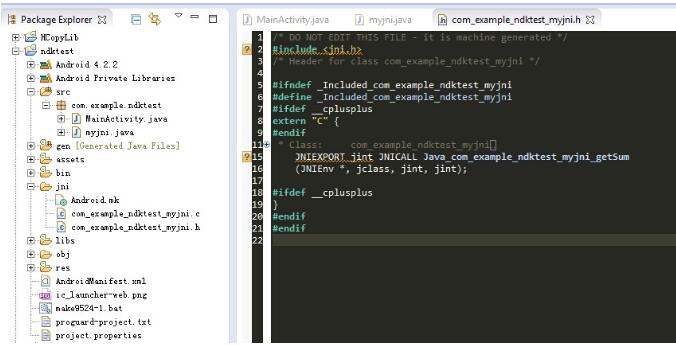 运行cmd,定位到ndktest根目录下, 运行命令 javah -classpath bin\classes -d jni com.example.ndktest.myjni 会在jni文件下生成一个h头文件。