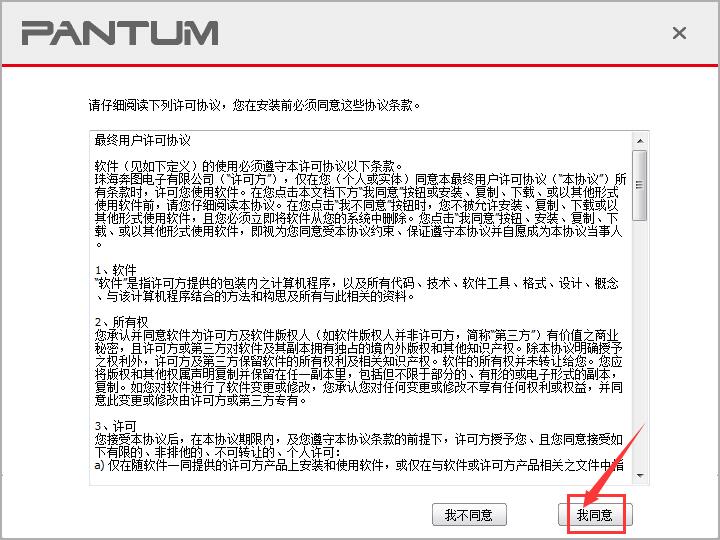 1.知识兔将奔图P2500NW打印机和电脑进行连接,开启电源,知识兔双击Autorun.exe文件,出现软件的许可协议界面,知识兔选择【我同意】