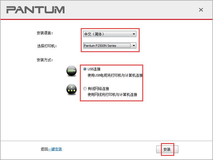 4.选择安装语言【中文简体】,知识兔选择打印机【Pantum P2500N series】,知识兔选择安装方式,单击【安装】即可