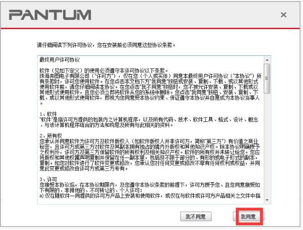 1.知识兔将奔图P2600N打印机和电脑进行连接,开启电源,知识兔双击Autorun.exe文件,出现软件的许可协议界面,知识兔选择【我同意】