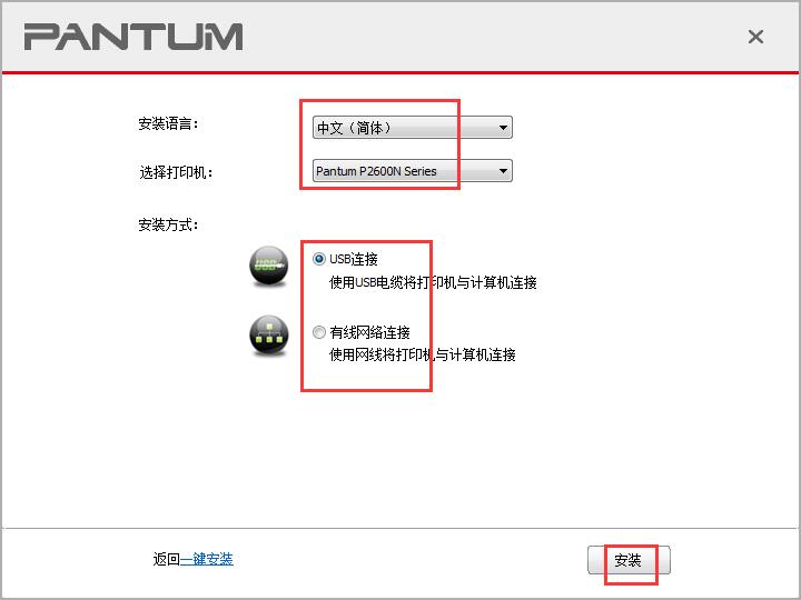 4.选择安装语言【中文简体】,知识兔选择打印机【Pantum P2600N series】,知识兔选择安装方式,单击【安装】即可