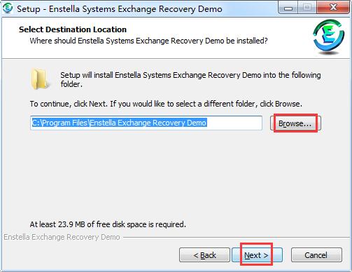 3.选择软件的安装文件夹,默认的是【C:\Program Files\Enstella Exchange Recovery Demo】,单击【browse】自定义