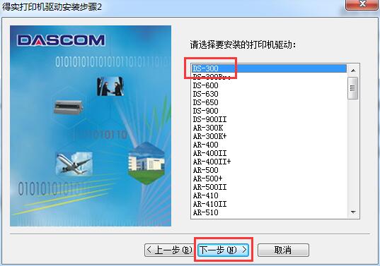 3.选择打印机选项【DS-300】,单击【下一步】