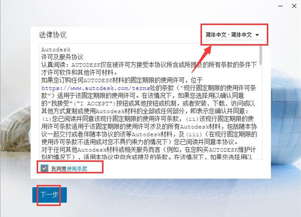 1.知识兔将下载的revit2022解压,再解压Revit_2022_G1_Win_64bit.iso文件,找到安装文件,知识兔双击运行Setup.exe文件,出现Revit2022许可协议界面,知识兔选择安装语言【简体中文】,勾选【我同意使用条款】,单击【下一步】