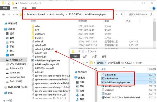 7.知识兔将crack补丁中的AdskLicensingAgent.exe、adlmint.dll文件复制到下列路径中,替换;