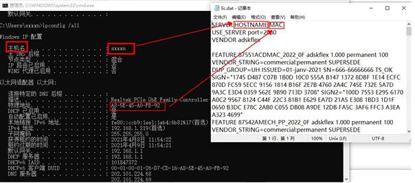 10.运行cmd,知识兔输入ipconfig /all,编辑lic.dat并更改HOSTNAME和MAC;