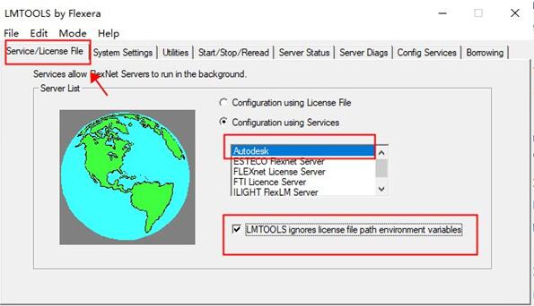 12.在”service/license file”中选择刚才的 Autodesk服务,然后知识兔勾选下面的ignore license file path env var;