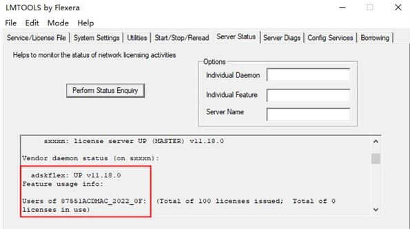 14.最后在”server status”知识兔点击”perform status enquiry”,看到有adskflex: UP v11.18.0就表示破解成功了,没有则找到问题重试;