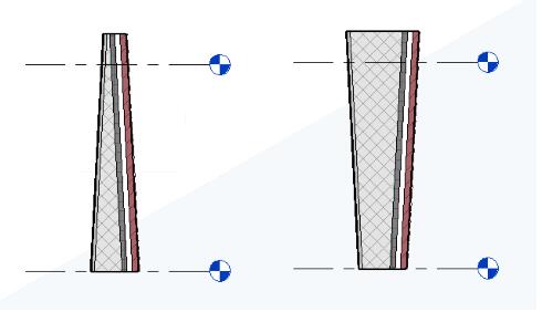 创建具有可变宽度层的墙类型,知识兔以启用锥形面。在”墙类型”属性中定义锥角。根据需要,知识兔使用单个墙的实例属性替代它们。正角度将使面的顶边朝向墙中心倾斜。负角度将使面的顶边背离墙中心倾斜。定义测量墙总宽度的位置:墙的顶部、底部或基础。