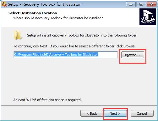 4.选择安装目的地,默认的是【C:\Program Files (x86)\Recovery Toolbox for Illustrator】,单击【browse】自定义