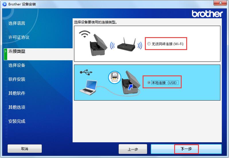 4.选择连接类型,分为【无线网络连接】和【本地连接】两种,自由选择,单击【下一步】