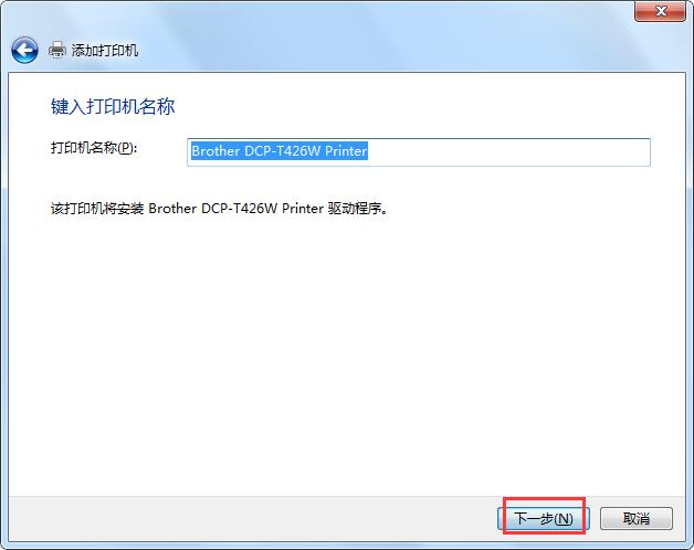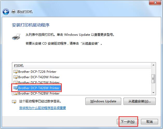 7.选择打印机驱动程序【Brother DCP-T426W Printer】,单击【下一步】