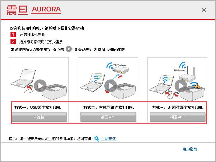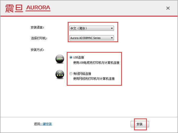 5.选择安装语言【中文简体】,知识兔选择打印机型号默认即可,知识兔选择安装方式,知识兔包括USB连接和有线网络连接两种,知识兔根据需要选择,然后知识兔单击【安装】开始安装进程