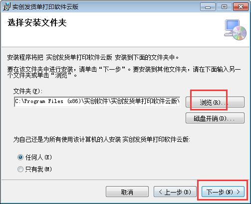 2.选择安装文件夹,默认的为【C:\Program Files (x86)\实创软件\实创发货单打印软件云版\】,单击【浏览】自定义