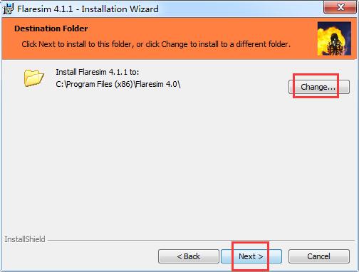 3.选择软件的安装文件夹,默认是【C:\Program Files (x86)\Flaresim 4.0\】,单击【change】修改