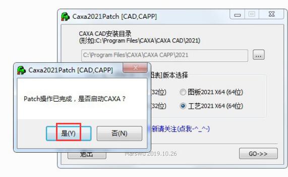 7.知识兔将破解补丁patch.exe放到软件的安装目录下,知识兔选择CAXA工艺图表2021安装位置和版本,单击【GO】,弹出如图窗口,单击【是】