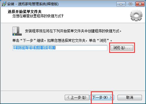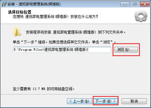 2.选择软件的安装位置,默认的是【D:\Program Files\速拓家电管理系统(辉煌版)】,单击【浏览】自定义