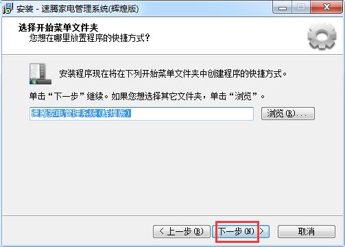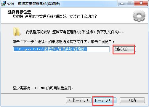 2.选择安装位置,默认的是【D:\Program Files\速腾家电管理系统(辉煌版)】,单击【浏览】修改