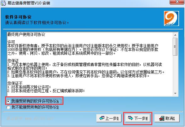 2.阅读软件的许可协议,勾选【我接受所有的软件许可协议】,单击【下一步】