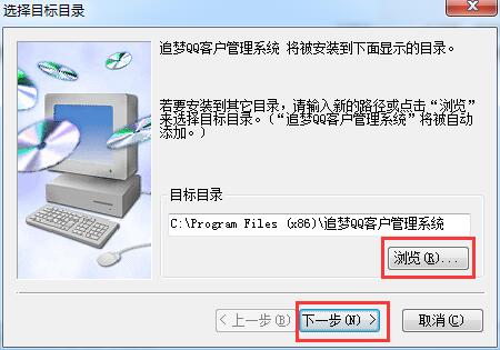1.知识兔双击追梦客户管理系统.exe,进入安装界面,知识兔选择安装位置,默认的是【C:\Program Files (x86)\追梦QQ客户管理系统】,单击【浏览】修改