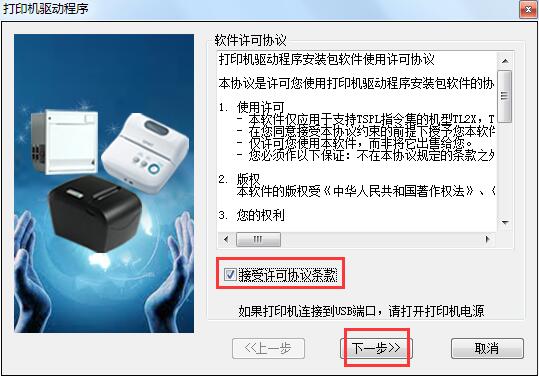 3.知识兔小编是win7系统,知识兔双击运行SP-DRV-TSPL-LABEL(v2.9).exe文件,出现软件许可协议内容,勾选【接受许可协议条款】,单击【下一步】